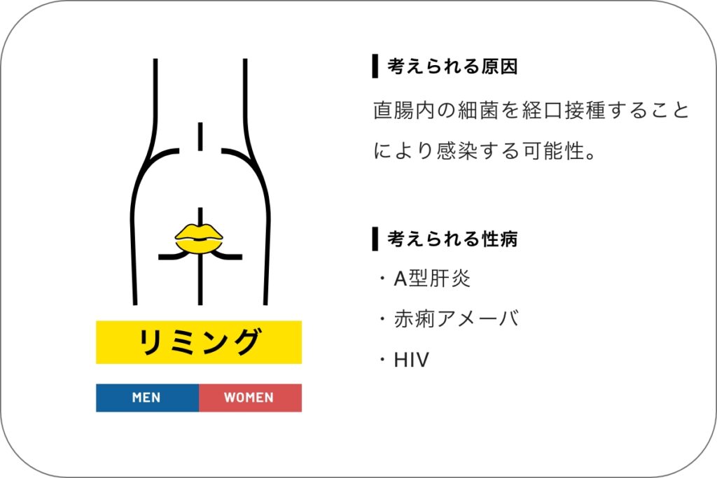 リミングとは、性行為の1つで、相手のアナルを口や下で愛撫することを言います。直腸内の病原体を経口摂取することで糞口感染が起こる可能性があ理ます。
