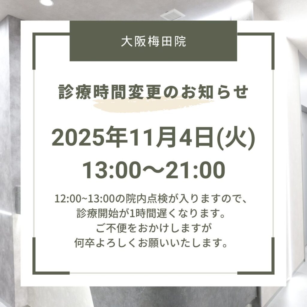 お知らせ 2025年11月4日(火) 診療開始が13:00~となります TOP > 大阪梅田院からのお知らせ > お知らせ > 2025年11月4日(火) 診療開始が13:00~となります 公開日:2025.10.29 2025年11月4日(火)大阪梅田院の院内設備の点検による影響で診療開始時間を通常より1時間遅らせて営業いたします。患者さまにはご不便をおかけし誠に申し訳ございませんが、安全で快適な環境維持のための点検となります。何卒ご理解のほどお願い申し上げます。 全国の クリニック 横浜院 渋谷院 名古屋院 札幌院 大阪梅田院