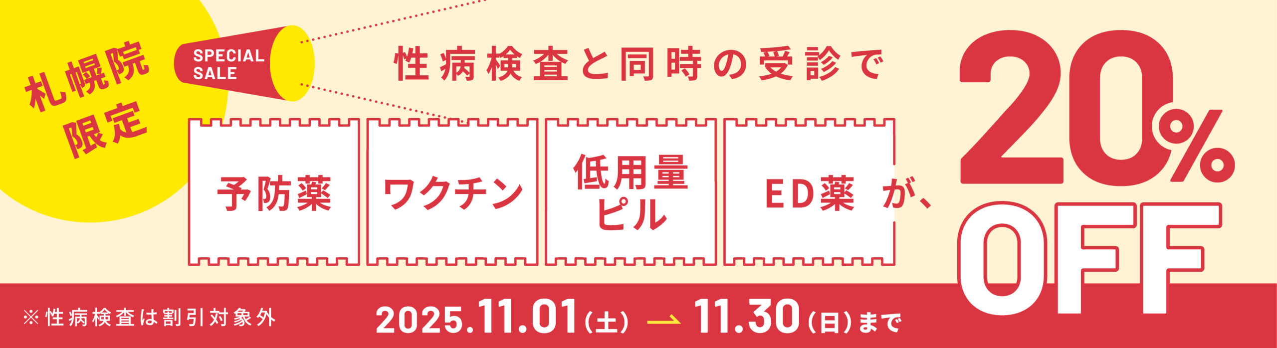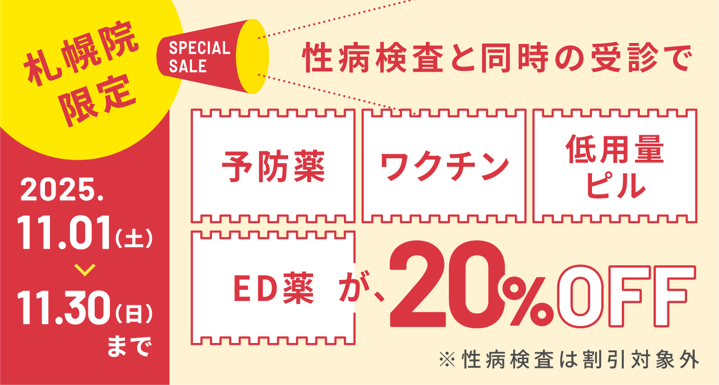 性病検査と同時の受診で 「予防薬」 「ワクチン」 「低用量ピル」 「ED薬」 が20%OFFになります。