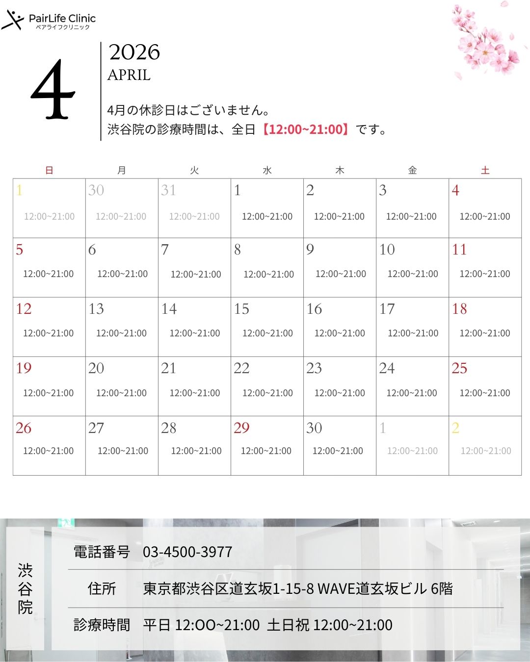 2026年4月は、休診日がございません。土日祝も休まず診療しておりますので、性病検査・治療をご希望の方はお気軽にご来院くださいませ。渋谷院の診療時間は全室【12:00~21:00】となっております。