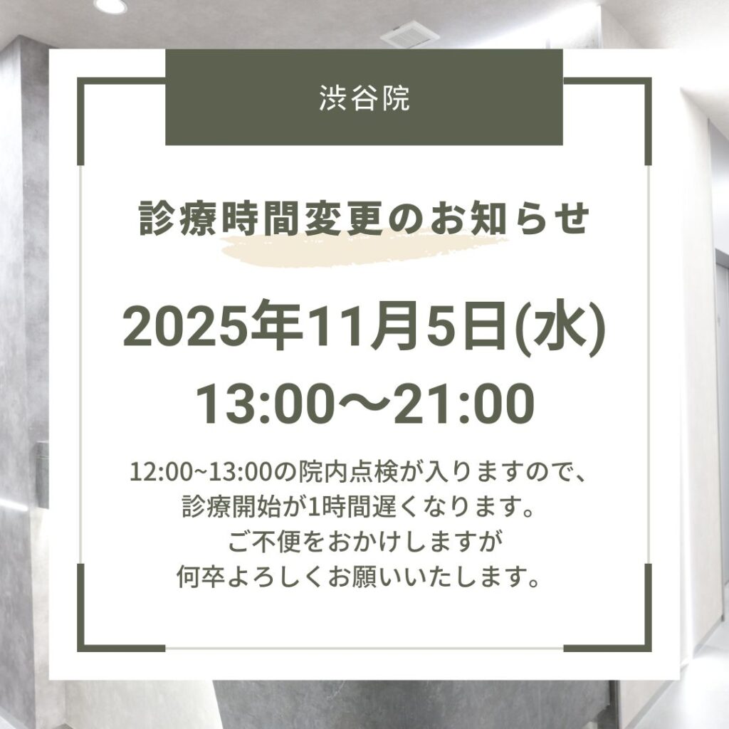 2025年11月5日(水)渋谷院の院内設備の点検による影響で診療開始時間を通常より1時間遅らせて営業いたします。患者さまにはご不便をおかけし誠に申し訳ございませんが、安全で快適な環境維持のための点検となります。何卒ご理解のほどお願い申し上げます。