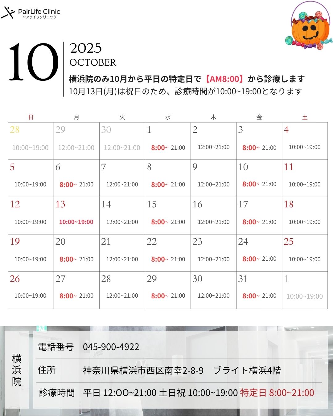 10月13日(月)が祝日のため、診療時間が10:00~19:00となります。