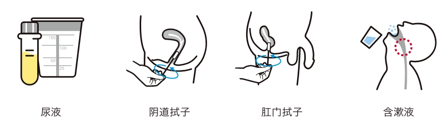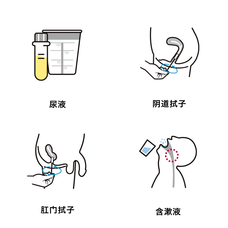 男性使用尿液进行检测,女性则使用阴道分泌物进行检测。对于咽喉部位的感染,男女均可通过含漱液进行检测。对于肛门部位的感染,则通过使用棉签擦拭肛门周围采集样本进行检测。由于检测为自行采样,因此无需向他人展示私密部位。