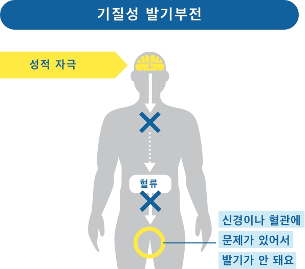 신경성 원인의 경우, 뇌졸중, 척수 손상, 당뇨병성 말초신경병증 및 추간판 탈출증(디스크)과 같은 질환이 성적 자극의 전달을 방해하여 발기부전을 유발할 수 있습니다.