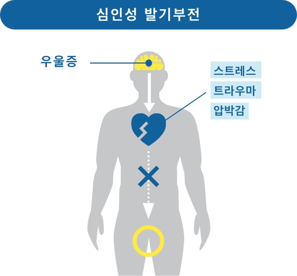 심인성 발기부전은 뚜렷한 신체적 이상이 없음에도 불구하고, 심리적 또는 정신적 요인에 의해 발생하는 발기 장애를 의미합니다. 주요 원인으로는 직장이나 가정에서의 스트레스, 인간관계로 인한 불안감, 그리고 과거의 성적 경험으로 인한 심리적 트라우마 등이 있습니다.