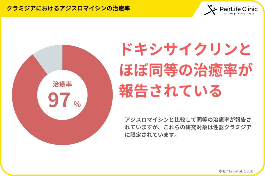 性器クラミジアを完全に除菌できた割合、アジスロマイシン 1.0g単回投与の有効率は 97% であり、ドキシサイクリン(1日2回7日間)の 98% と同等であることが示されています。