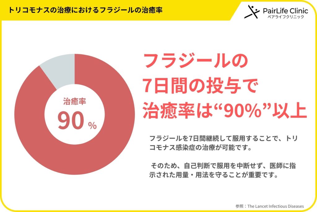 また、フラジールを用いたトリコモナス治療では、7日間投与により90%以上の高い治癒率が報告されています。