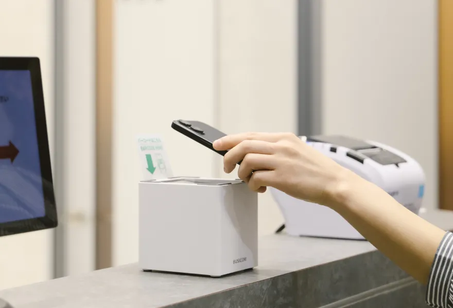 ご来院されましたら、院内に設置しているiPadより受付をお願いいたします。事前来院受付(ご予約)がお済みの方は、青色の「予約済み」ボタンをタッチ。事前来院受付をされていない方は、赤色の「受付」ボタンをタッチしてください。いずれかのボタンをタッチすると受付番号が発券されますので、番号札をお受け取りのうえ、待合室にてお待ちください。