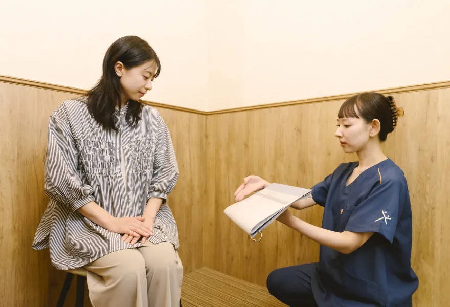 検査や診察を開始する前に、事前にご回答いただいた問診内容をもとに、専門スタッフがカウンセリングを行います。カウンセリング時に検査項目や治療内容を確認し、その場でお会計金額を確定いたします。